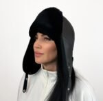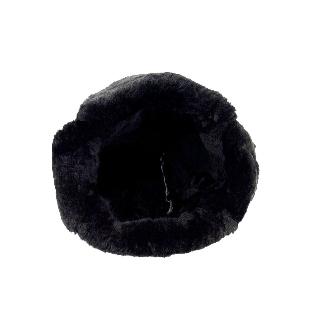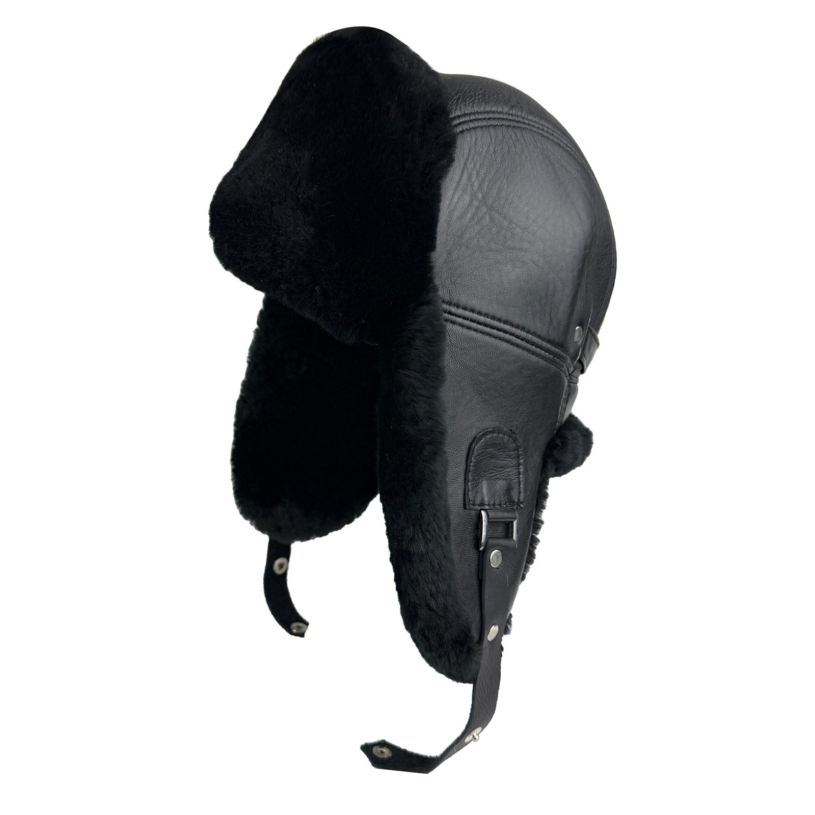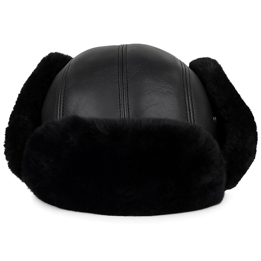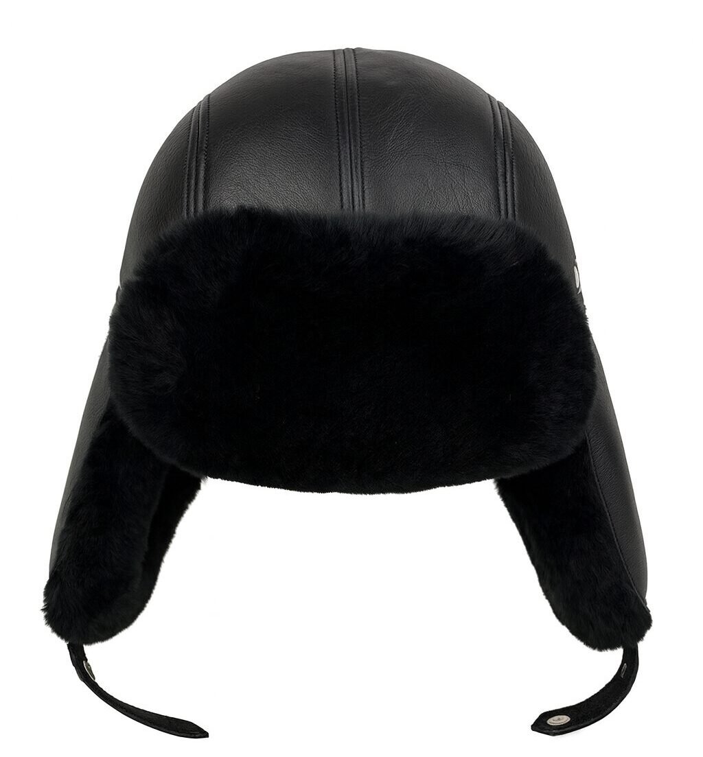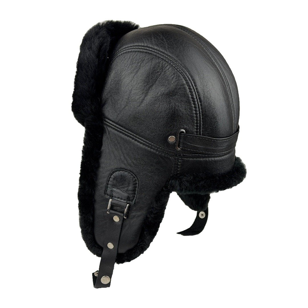 Black sheepskin leather trapper hat with fur lining and ear flaps